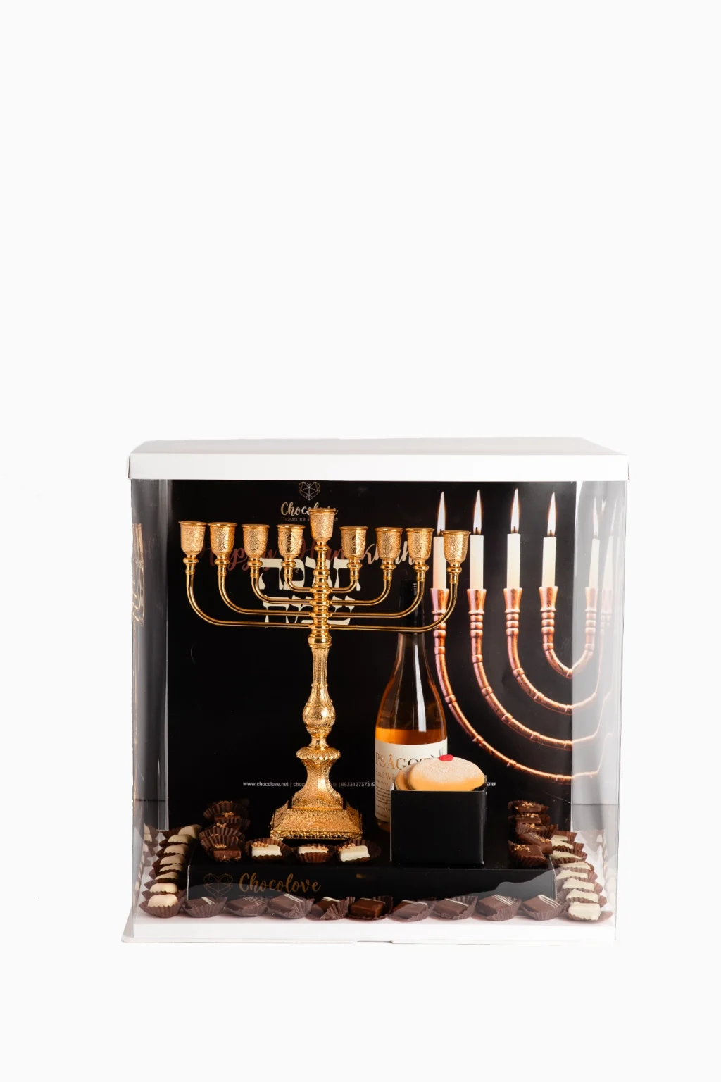 מארז חנוכה חנוכיה עקית, בקבוק יין, עוגיות סופגניה ושוקלדים