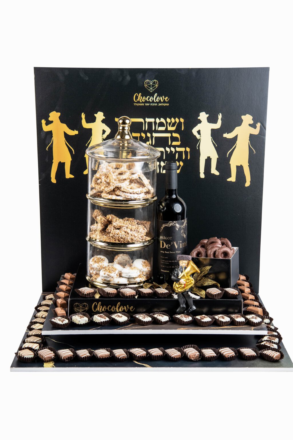 מארז ושמחת בחגיך יוקרתי כלי לעוגיות קומות, איש מנגן, יין ומגוון שוקולדים