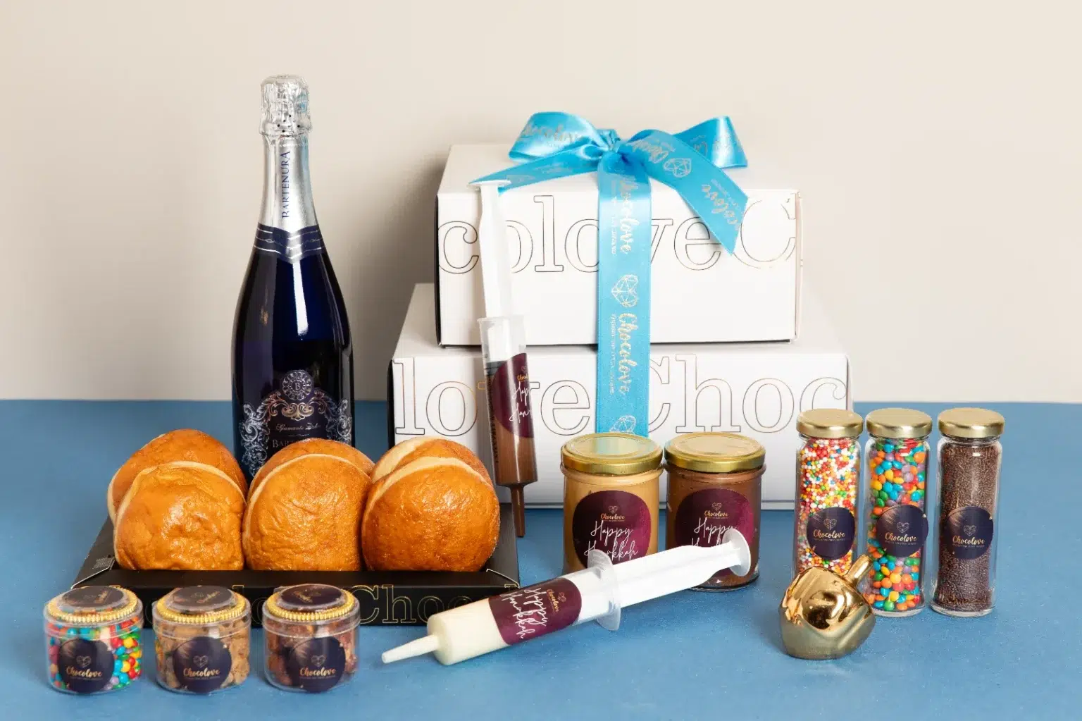 מארז חנוכה גדול עם בקבוק יין סופגניות ושוקולדים