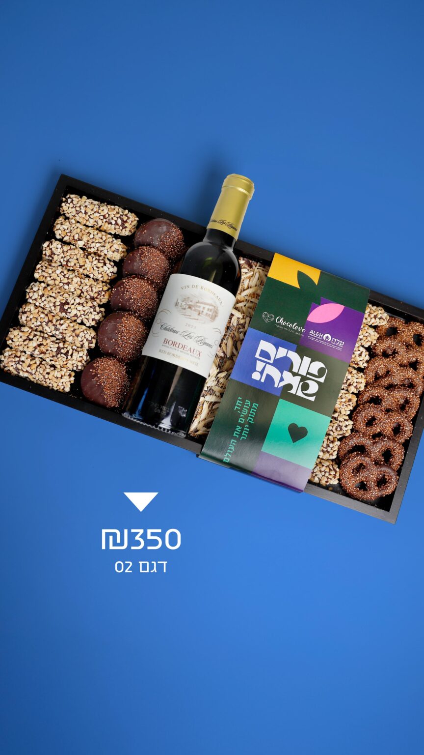 עושים את העולם מתוק יותר עם עלה, מגש פורים המכיל שוקולדים ויין