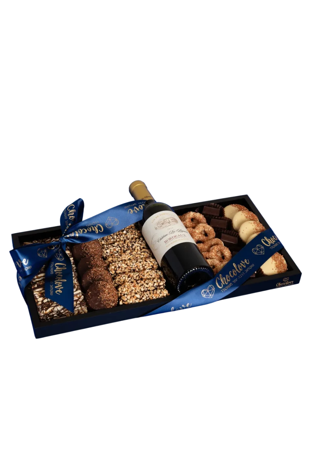 מגש מפנק בינוני מכיל בקבוק יין ושוקולדים
