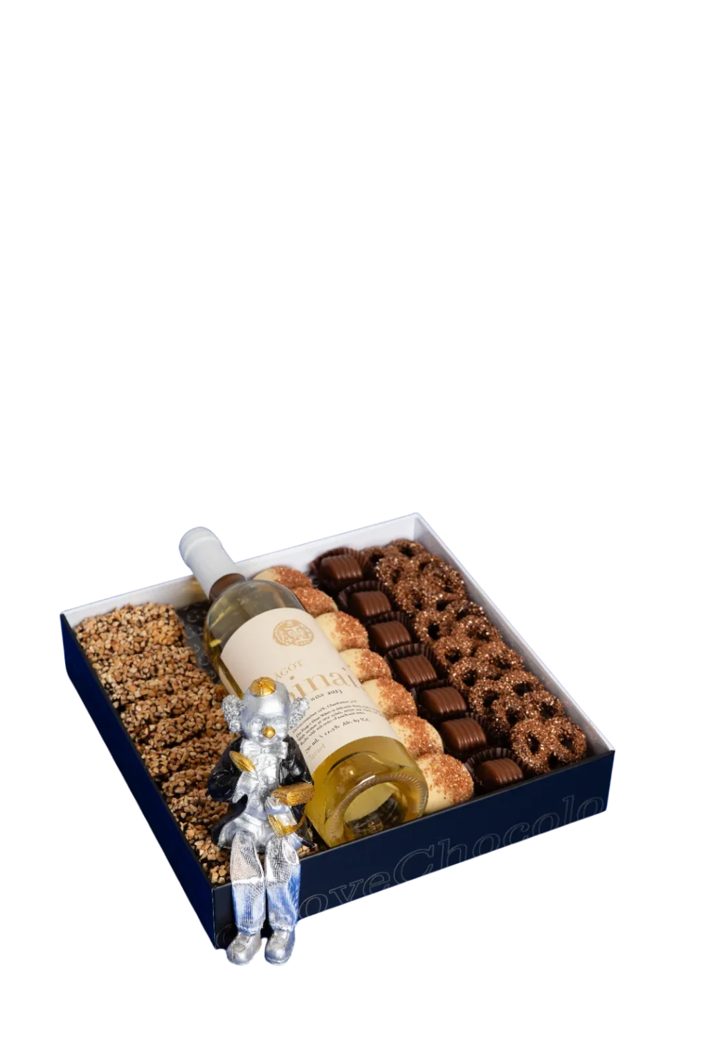 מגש מפנק בינוני מכיל בקבוק יין, ליצן ושוקולדים