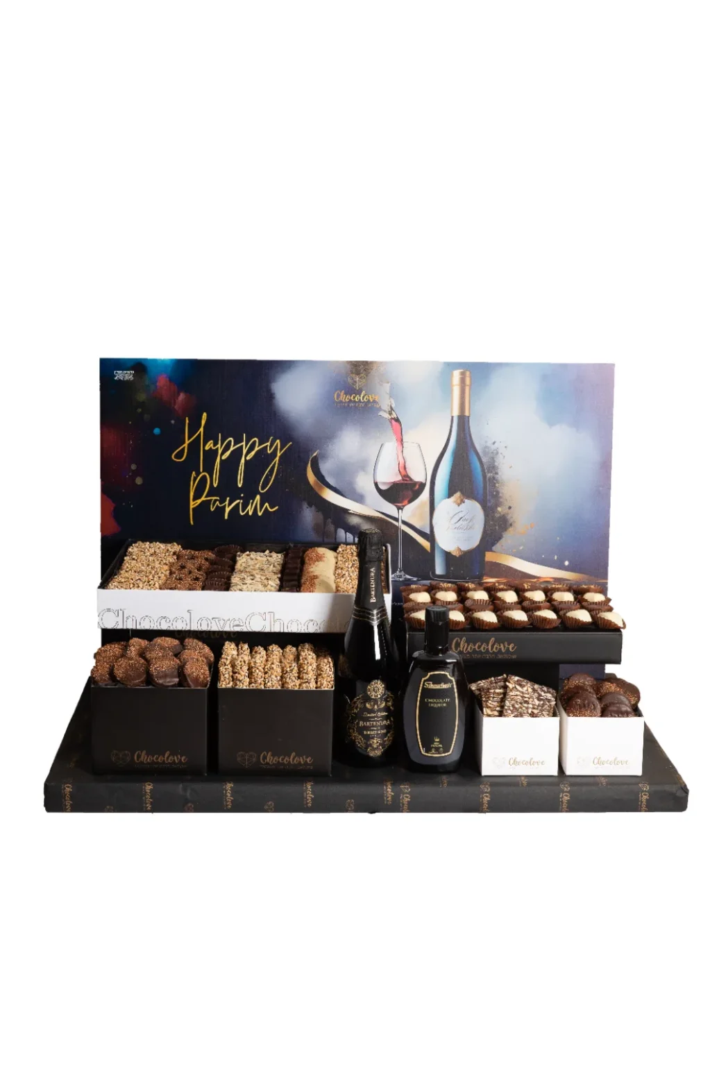 מגש פורים גדול מאוד מעוצב ליקרים ומגוון שוקולדים