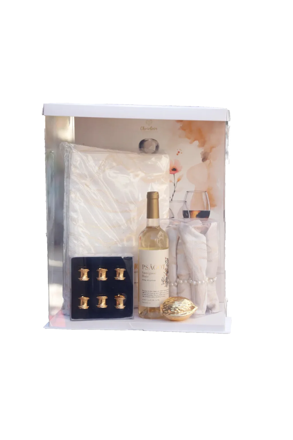 סטייל בוקס מכיל סט מפה (2.6-1.6 מ') ומפיות, חבקים ובקבוק יין