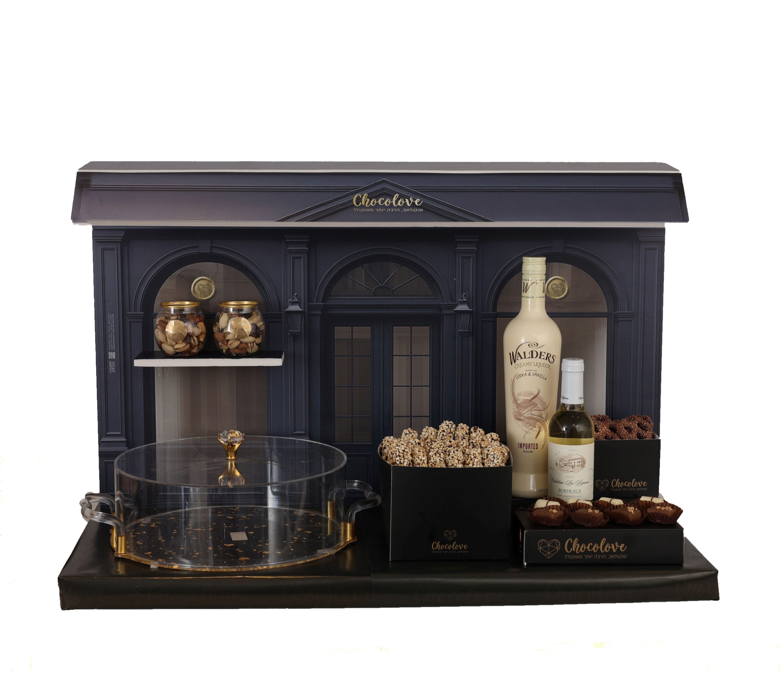 עיצוב מפואר . פרלינים . ליקר . יין . ווינס . פיצוחים . כלי לעוגה אקריליק