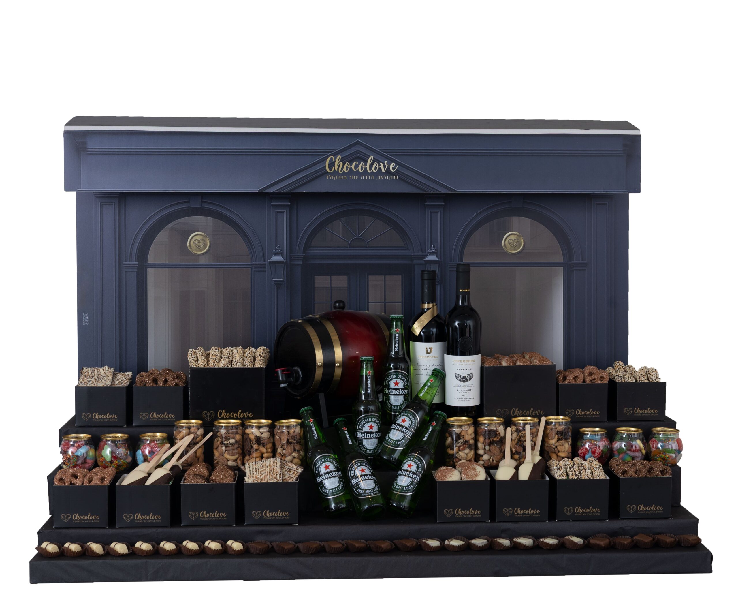 עיצוב מפנק ביותר . יינות מובחרים . בירות . פרלינים . ווינס .פיצוחים . גליס . חבית יין
