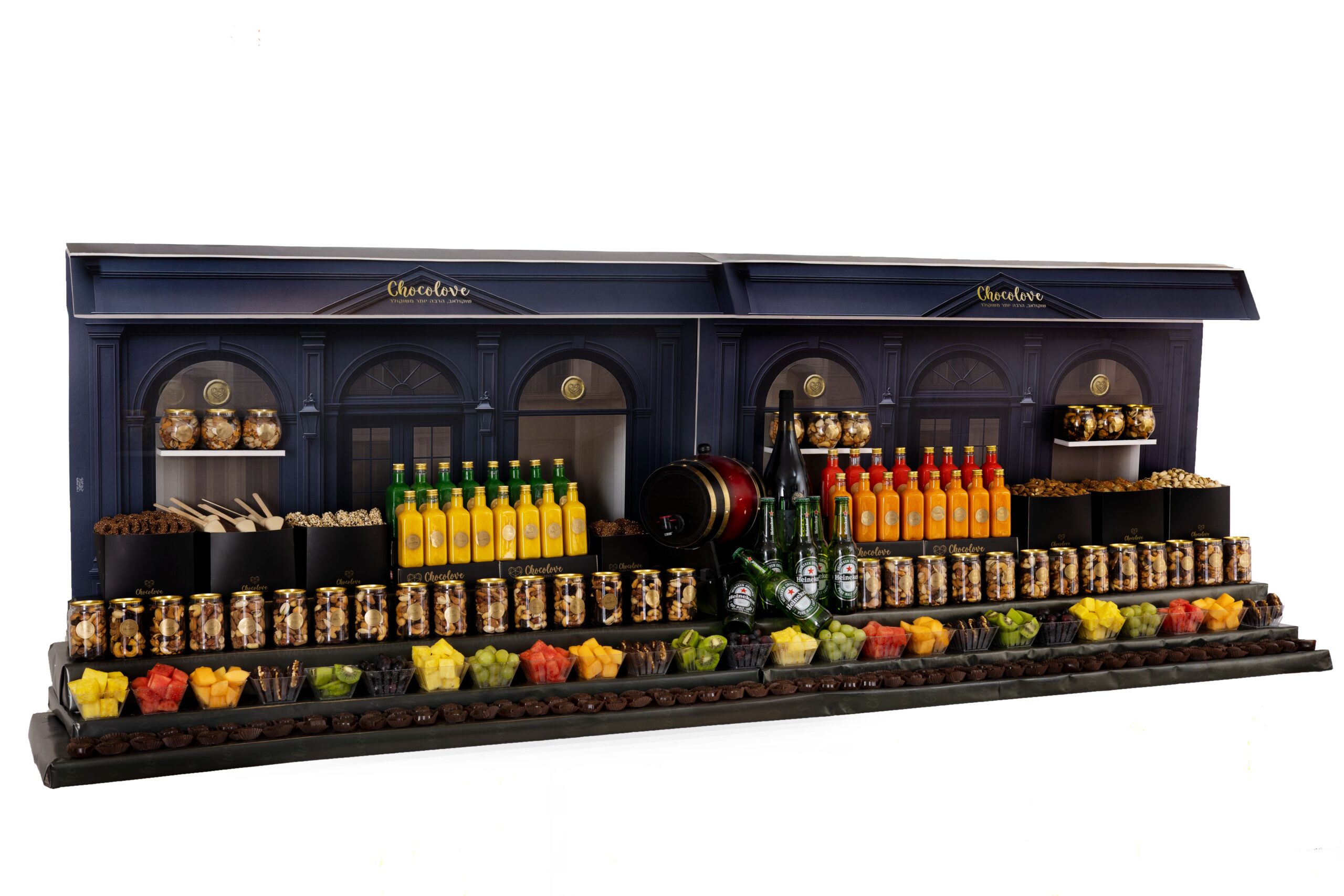 עיצוב שתי מטר . פירות – שוקולדים – שיקיים – פיצוחים – בירות – יין וכלי ליין חבית –